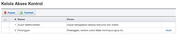 , sedangkan untuk mengubah klik pada kata Ubah di kolom paling kanan yang bersesuaian dengan akses kontrol yang akan diubah. Maka Anda akan diarahkan ke halaman form akses kontrol.